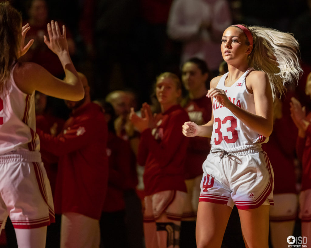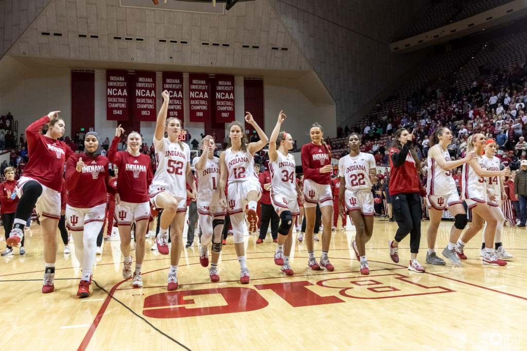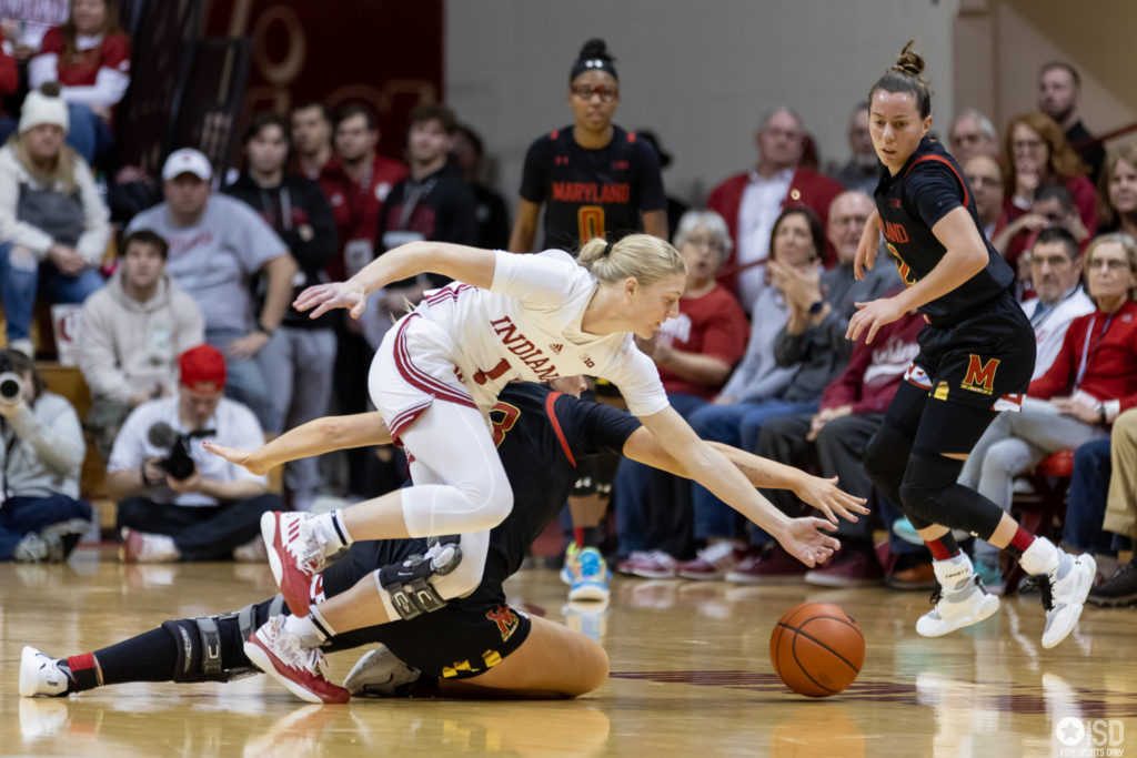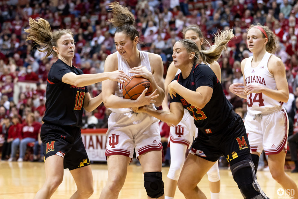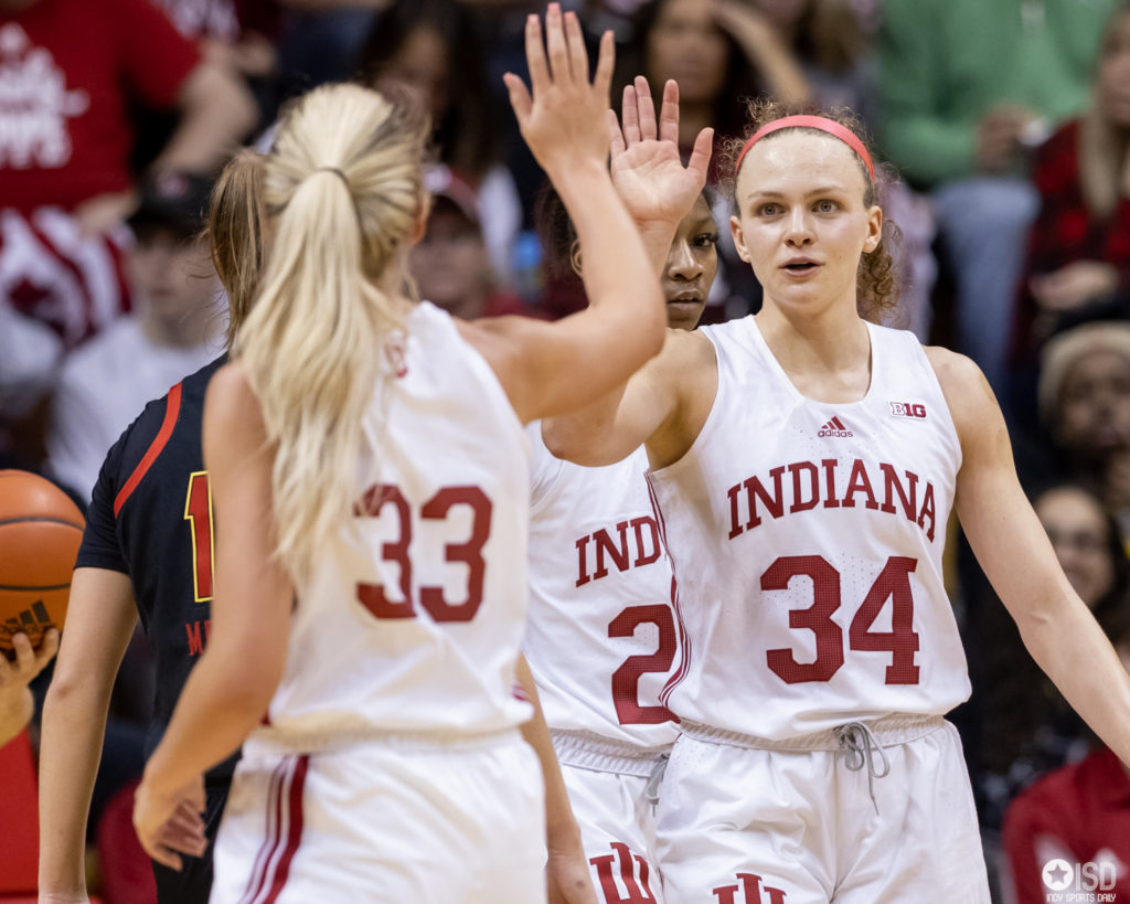 No. 6 Indiana women’s basketball pulls away from No. 9 Maryland late, 68 – 61 Big Ten Hoosier Women's Game Recaps Indiana Hoosiers Indiana Hoosiers by Tony Vasquez - January 12, 2023January 13, 20230 Bloomington, IN The No. 6 Indiana women’s basketball team was tested against No. 9 Maryland last night in Simon Skjodt Assembly Hall in a battle between two top-ten-ranked teams. The Hoosiers used a 7-point run in the fourth quarter after Maryland had tied the game to pull away with the tough-fought 68 -61 Big Ten win. The Hoosiers were led by Sydney Parrish’s 18 points on 3 of 7 from the three-point line while playing tough defense and grabbing four rebounds. After being injured in late November, Grace Berger’s second game back to the lineup was also a significant factor in Indiana’s victory over Maryland. Berger’s 11 points, as well as her overall calming factor on the offensive end with her ball-handling skills, as the Hoosiers faced a heavy press for most of the game, were vital to Indiana maintaining control against the frantic pace from Maryland. Indiana played well late in the fourth to pull away from Maryland with clutch shots coming from Yarden Garzon, Grace Berger, and Mackenzie Holmes. Next for Indiana is another home game on Sunday, as they will face Wisconsin with a 2 pm start. Photo Gallery: Indiana vs. Maryland Photos Indiana’s Sydney Parrish (33) during the player introduction at Skjodt Assembly Hall on January 12, 2023, in Bloomington, Indiana. (Photo by Tony Vasquez) Indiana women’s basketball team defeated Maryland 68 -61 at Skjodt Assembly Hall on January 12, 2023, in Bloomington, Indiana. (Photo by Tony Vasquez) The Indiana Hoosier cheerleaders’ entertain the crowd during a timeout at Skjodt Assembly Hall on January 12, 2023, in Bloomington, Indiana. (Photo by Tony Vasquez) Indiana’s Grace Berger drives the ball into the paint at Skjodt Assembly Hall on January 12, 2023, in Bloomington, Indiana. (Photo by Tony Vasquez) Indiana women’s basketball team defeated Maryland 68 -61 at Skjodt Assembly Hall on January 12, 2023, in Bloomington, Indiana. (Photo by Tony Vasquez) Indiana women’s basketball team defeated Maryland 68 -61 at Skjodt Assembly Hall on January 12, 2023, in Bloomington, Indiana. (Photo by Tony Vasquez) Indiana women’s basketball team defeated Maryland 68 -61 at Skjodt Assembly Hall on January 12, 2023, in Bloomington, Indiana. (Photo by Tony Vasquez) Indiana women’s basketball team defeated Maryland 68 -61 at Skjodt Assembly Hall on January 12, 2023, in Bloomington, Indiana. (Photo by Tony Vasquez) The Indiana crowd celebrated during a timeout at Skjodt Assembly Hall on January 12, 2023, in Bloomington, Indiana. (Photo by Tony Vasquez) Indiana celebrates their 68 -61 win over Maryland at Skjodt Assembly Hall on January 12, 2023, in Bloomington, Indiana. (Photo by Tony Vasquez) -Tony Vasquez