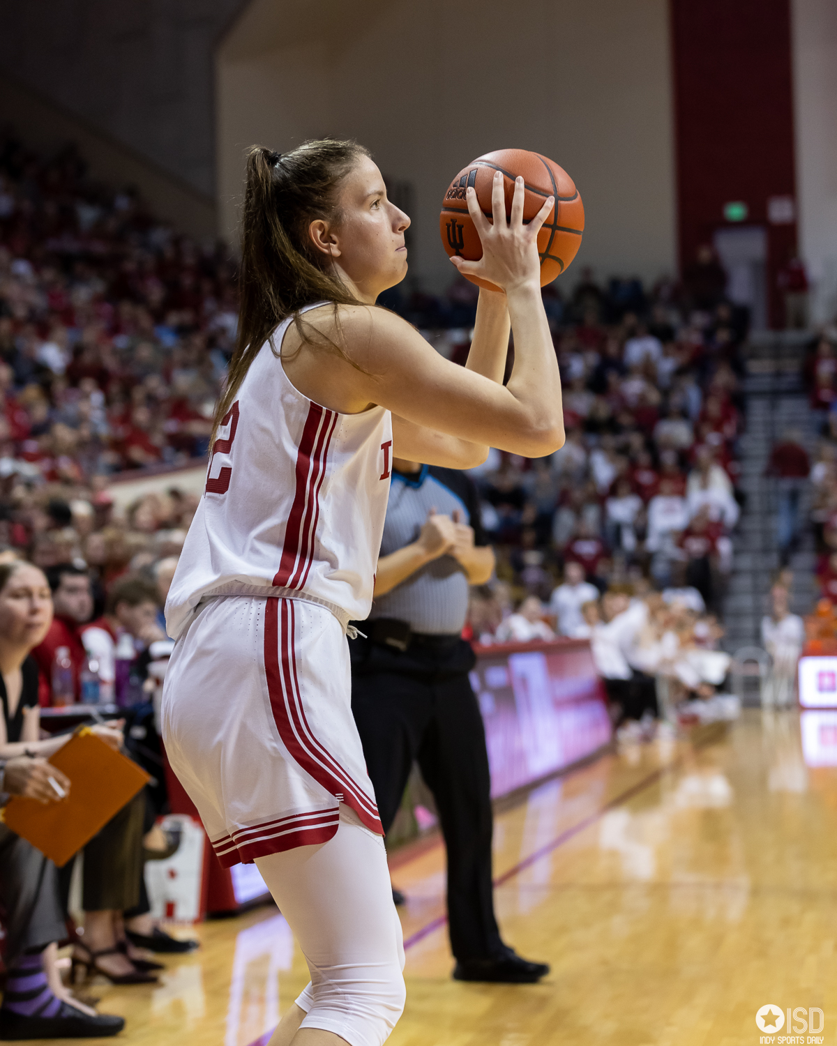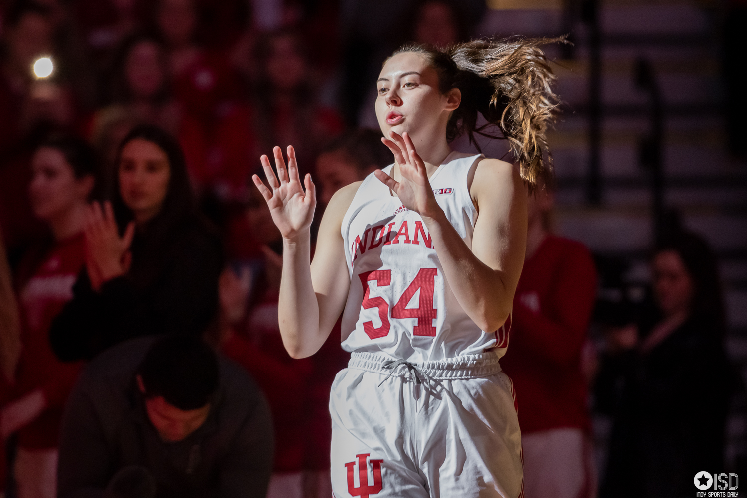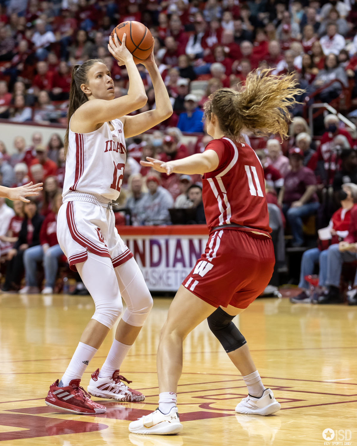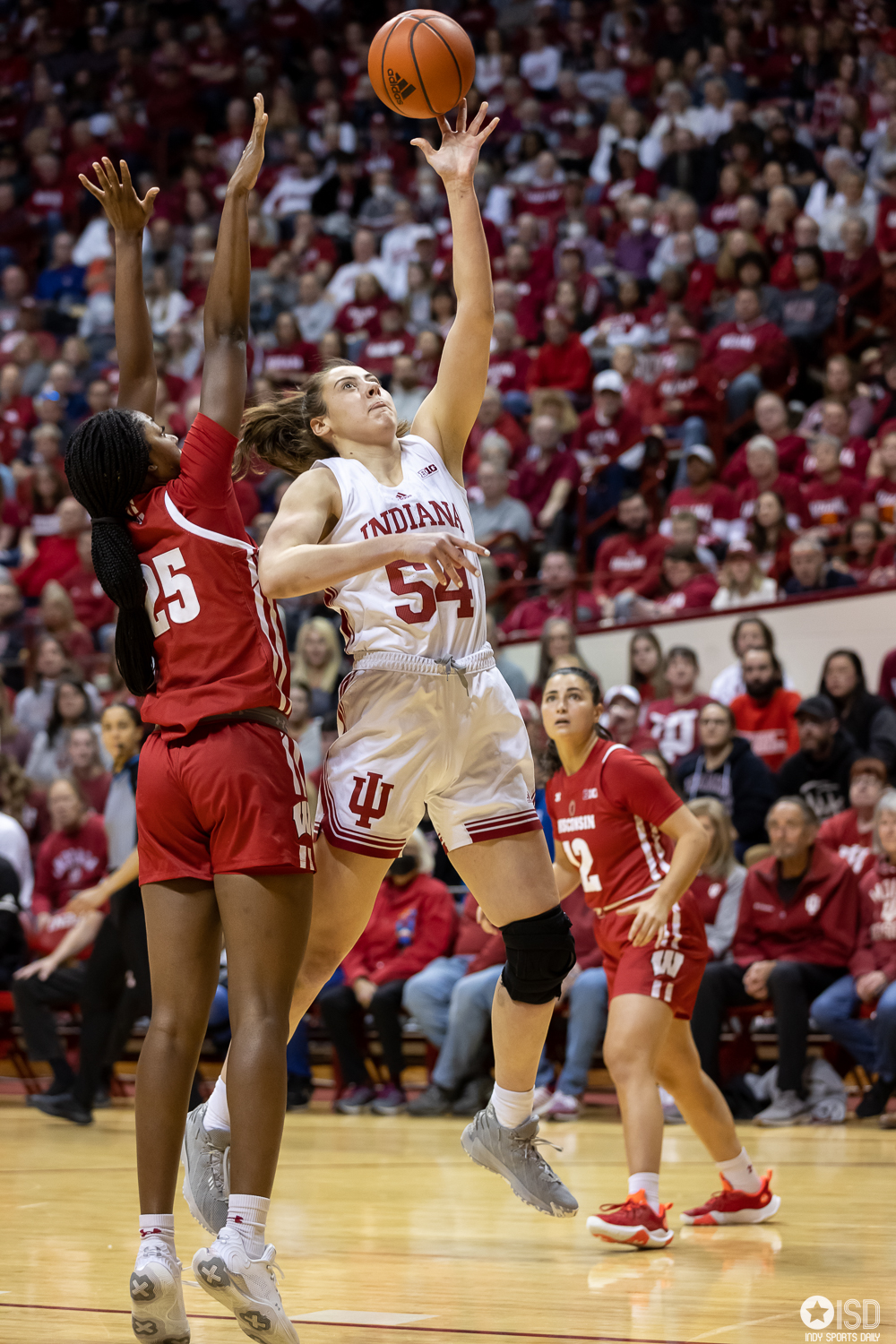 Indiana women win big over Wisconsin in front of a record crowd Big Ten Big Ten News Hoosier Women's Game Recaps Indiana Hoosiers Indiana Hoosiers by Tony Vasquez - January 16, 2023January 16, 20230 Bloomington, IN The Indiana women routed Wisconsin 93 – 56 at Simon Skjodt Assembly Hall in front of a regular season record crowd of 10,422 on Sunday afternoon. In the post-game interview, the Hoosier’s head coach Teri Moren said, “I want to comment quickly on the crowd, which was unbelievable. The second largest in history in our program, which is pretty terrific. It was one of those days where there was a lot of really good basketball that they were able to see.” One of the standouts on Sunday afternoon was the shooting of freshman Yarden Garzon who made four 3-pointers on 7 of 9 shooting with eight rebounds, seven assists, and 19 points for the game. In the post-game, the Israel native Yarden Garzon was asked what led to her big game; she mentioned that her family was in attendance and had not seen them since August. Yarden said, “It’s been a lot for me, so it was great to look up and see their faces.” Senior Mackenzie Holmes led the Hoosiers with 29 points, eight rebounds, and one assist. Wisconsin had no answer on how to Holmes in the paint. With the game in hand, Indiana rested Holmes late as she continued to root on her teammates from the bench. Indiana’s defense held the Badgers to just 34.9 percent field goal shooting and 20 percent on three while scoring 31 points off 21 Wisconsin turnovers. Next for the 16-1 Hoosiers is a road trip to Illinois on Wednesday at 8 p.m. Photo Gallery: Indiana vs Wisconsin Photos An Indiana fan cheers for the Hoosiers to beat the Badgers at Skjodt Assembly Hall on January 15, 2023, in Bloomington, Indiana. (Photo by Tony Vasquez) The Indiana band performs the tipoff at Skjodt Assembly Hall on January 15, 2023, in Bloomington, Indiana. (Photo by Tony Vasquez) Indiana’s Mackenzie Holmes (54) during player introductions at Skjodt Assembly Hall on January 15, 2023, in Bloomington, Indiana. (Photo by Tony Vasquez) Indiana’s Sydney Parrish (33) shoots a three-pointer at Skjodt Assembly Hall on January 15, 2023, in Bloomington, Indiana. (Photo by Tony Vasquez) Indiana’s Yarden Garzon (12) shooting a jump shot at Skjodt Assembly Hall on January 15, 2023, in Bloomington, Indiana. (Photo by Tony Vasquez) Indiana’s Grace Berger (34) passes the ball along the baseline at Skjodt Assembly Hall on January 15, 2023, in Bloomington, Indiana. (Photo by Tony Vasquez) Indiana’s Yarden Garzon (12) scored 19 points at Skjodt Assembly Hall on January 15, 2023, in Bloomington, Indiana. (Photo by Tony Vasquez) Indiana’s Mackenzie Holmes (54) scores a basket in the paint at Skjodt Assembly Hall on January 15, 2023, in Bloomington, Indiana. (Photo by Tony Vasquez) Indiana women’s basketball team defeated Wisconsin 93 – 56 at Skjodt Assembly Hall on January 15, 2023, in Bloomington, Indiana. (Photo by Tony Vasquez) The Indiana cheerleaders entertain the crowd during a timeout at Skjodt Assembly Hall on January 15, 2023, in Bloomington, Indiana. (Photo by Tony Vasquez)