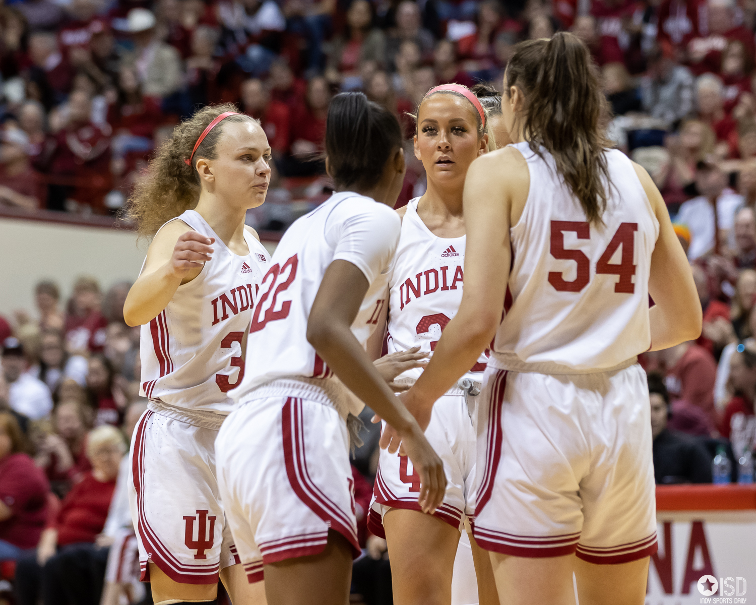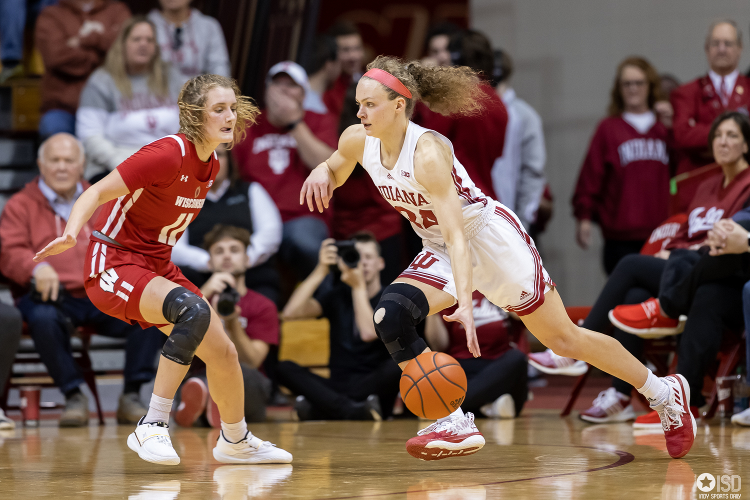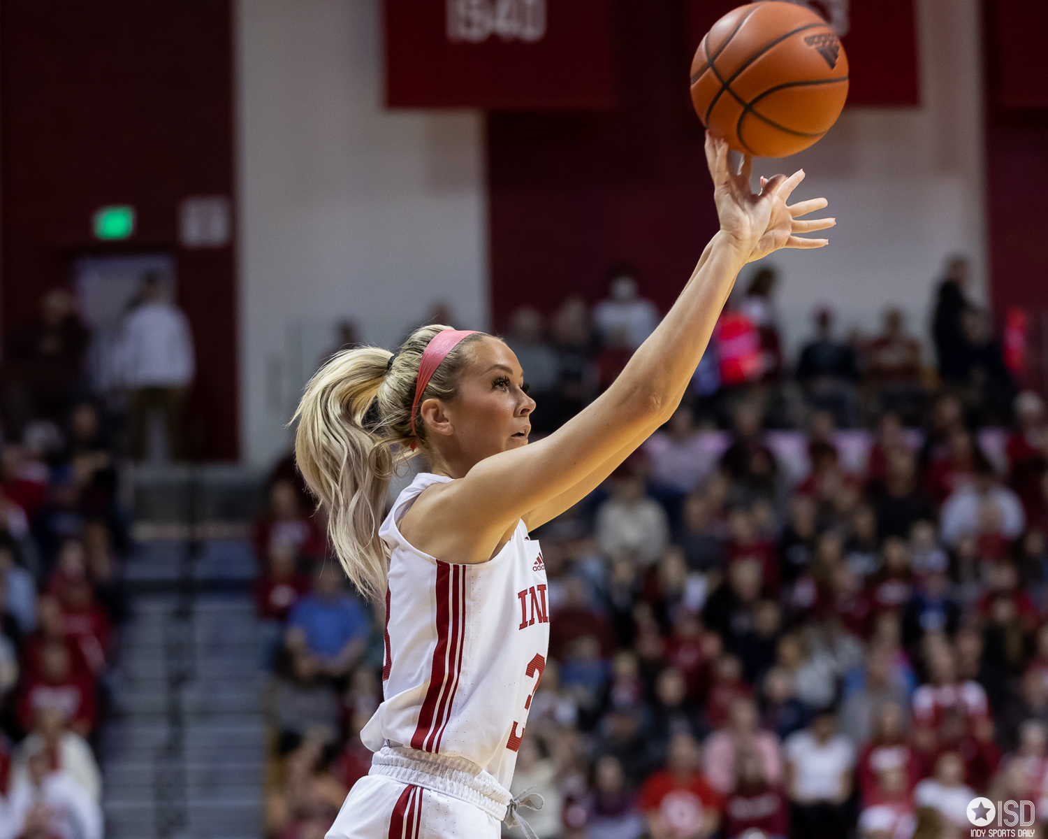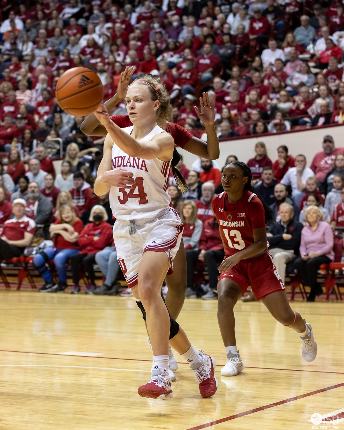 Indiana women win big over Wisconsin in front of a record crowd Big Ten Big Ten News Hoosier Women's Game Recaps Indiana Hoosiers Indiana Hoosiers by Tony Vasquez - January 16, 2023January 16, 20230 Bloomington, IN The Indiana women routed Wisconsin 93 – 56 at Simon Skjodt Assembly Hall in front of a regular season record crowd of 10,422 on Sunday afternoon. In the post-game interview, the Hoosier’s head coach Teri Moren said, “I want to comment quickly on the crowd, which was unbelievable. The second largest in history in our program, which is pretty terrific. It was one of those days where there was a lot of really good basketball that they were able to see.” One of the standouts on Sunday afternoon was the shooting of freshman Yarden Garzon who made four 3-pointers on 7 of 9 shooting with eight rebounds, seven assists, and 19 points for the game. In the post-game, the Israel native Yarden Garzon was asked what led to her big game; she mentioned that her family was in attendance and had not seen them since August. Yarden said, “It’s been a lot for me, so it was great to look up and see their faces.” Senior Mackenzie Holmes led the Hoosiers with 29 points, eight rebounds, and one assist. Wisconsin had no answer on how to Holmes in the paint. With the game in hand, Indiana rested Holmes late as she continued to root on her teammates from the bench. Indiana’s defense held the Badgers to just 34.9 percent field goal shooting and 20 percent on three while scoring 31 points off 21 Wisconsin turnovers. Next for the 16-1 Hoosiers is a road trip to Illinois on Wednesday at 8 p.m. Photo Gallery: Indiana vs Wisconsin Photos An Indiana fan cheers for the Hoosiers to beat the Badgers at Skjodt Assembly Hall on January 15, 2023, in Bloomington, Indiana. (Photo by Tony Vasquez) The Indiana band performs the tipoff at Skjodt Assembly Hall on January 15, 2023, in Bloomington, Indiana. (Photo by Tony Vasquez) Indiana’s Mackenzie Holmes (54) during player introductions at Skjodt Assembly Hall on January 15, 2023, in Bloomington, Indiana. (Photo by Tony Vasquez) Indiana’s Sydney Parrish (33) shoots a three-pointer at Skjodt Assembly Hall on January 15, 2023, in Bloomington, Indiana. (Photo by Tony Vasquez) Indiana’s Yarden Garzon (12) shooting a jump shot at Skjodt Assembly Hall on January 15, 2023, in Bloomington, Indiana. (Photo by Tony Vasquez) Indiana’s Grace Berger (34) passes the ball along the baseline at Skjodt Assembly Hall on January 15, 2023, in Bloomington, Indiana. (Photo by Tony Vasquez) Indiana’s Yarden Garzon (12) scored 19 points at Skjodt Assembly Hall on January 15, 2023, in Bloomington, Indiana. (Photo by Tony Vasquez) Indiana’s Mackenzie Holmes (54) scores a basket in the paint at Skjodt Assembly Hall on January 15, 2023, in Bloomington, Indiana. (Photo by Tony Vasquez) Indiana women’s basketball team defeated Wisconsin 93 – 56 at Skjodt Assembly Hall on January 15, 2023, in Bloomington, Indiana. (Photo by Tony Vasquez) The Indiana cheerleaders entertain the crowd during a timeout at Skjodt Assembly Hall on January 15, 2023, in Bloomington, Indiana. (Photo by Tony Vasquez)