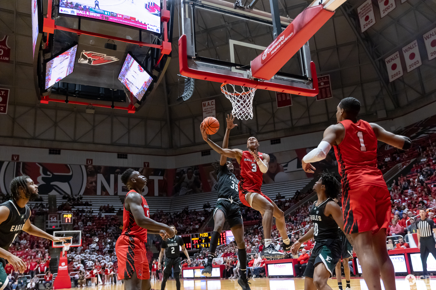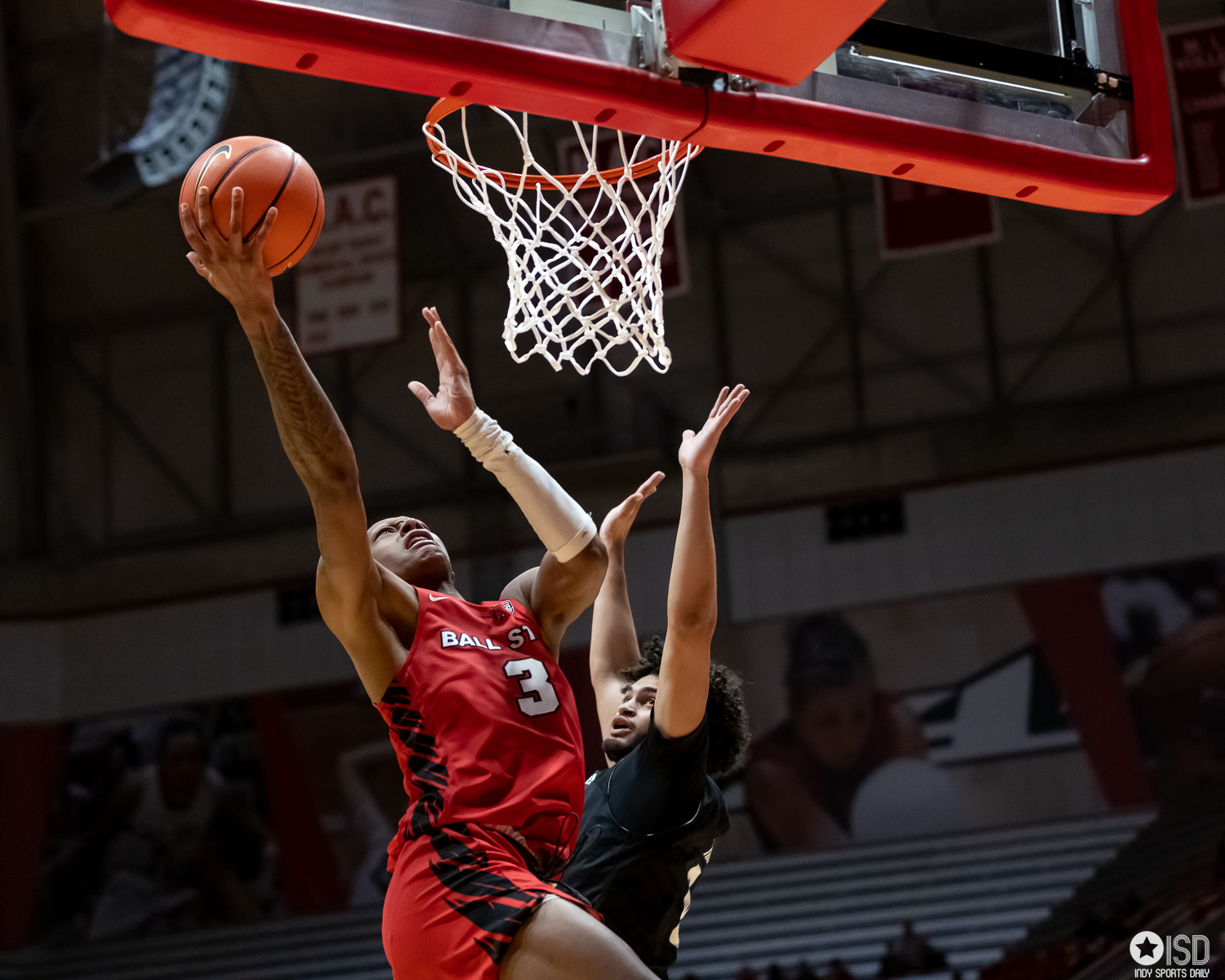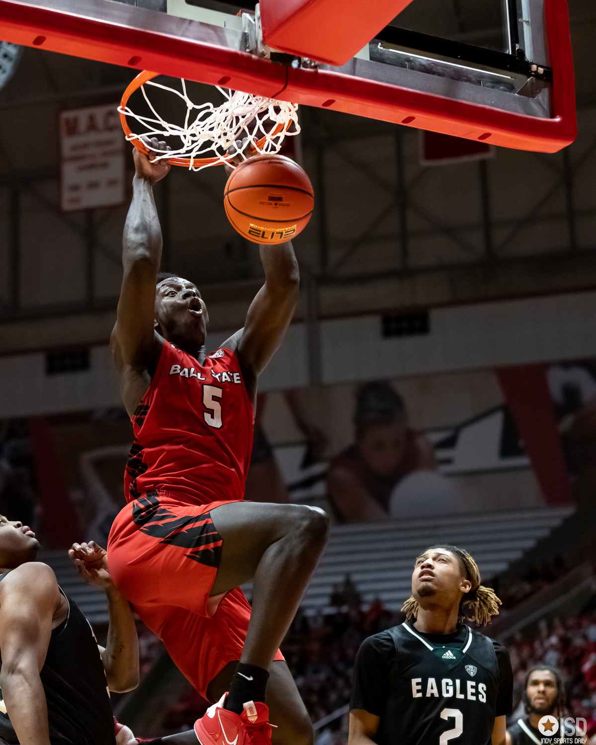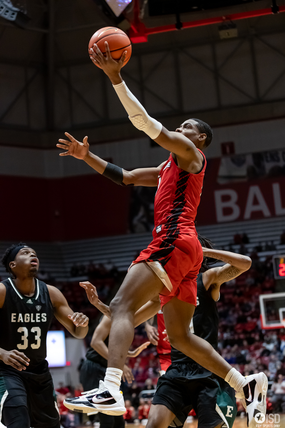 Ball State prevails in OT over Eastern Michigan 91 -90 Ball State University by Tony Vasquez - February 4, 2023February 5, 20230 Muncie, Indiana Ball State’s team effort on Friday night prevailed over the individual showcase of the Eastern Michigan Eagles star Emoni Bates 35 point explosion. Bates, who has averaged over 21 points in the Mid-American Conference, has scored over 30 points for his fourth game of the season and third straight game with 35 or more per game. Bates had help from Tyson Acuff, who added 18 points, and Noah Farrahhan contributed 16 points in the losing effort. Ball State was led by center Payton Sparks, 22 points, 15 rebounds, and four assists. The Cardinals finished with five players scoring double figures: Mickey Pearson with 13, Jarron Coleman with 18, Demarius Jacobs with 16, Jaylin Sellers with 17, and Payton Sparks with 22. The Cardinals jumped out to an early 23 -13 lead in front of Worthen Arena’s largest crowd of 6,068 since 2009. The atmosphere and entertaining back-and-forth game, of course, went to overtime. At the end of regulation, the teams were all locked up at 78. In overtime, Ball State’s Payton Sparks’ layup with 15 seconds left gave the Cardinals an 88 -87 lead. Ball State hit some clutch free throws to close the game over Eastern Michigan. Next up for Ball State will be a road game at Central Michigan Chippewas on February 7 with a 7:00 PM tipoff on ESPN+. Photo Gallery: Ball State vs. Eastern Michigan Photo Gallery -Tony Vaquez Ball State’s Demarius Jacobs (1) drives the baseline against Eastern Michigan on February 3, 2023, at Worthen Arena in Muncie, Indiana. Photos by Tony Vasquez for Indy Sports Daily. Ball State’s Jarron Coleman (0) shoots over Eastern Michigan’s Emoni bates (21) on February 3, 2023, at Worthen Arena in Muncie, Indiana. Photos by Tony Vasquez for Indy Sports Daily. Ball State’s Jaylin Sellers (12) and Mickey Pearson (3) battle for a rebound against Eastern Michigan’s Emoni Bates (21) on February 3, 2023, at Worthen Arena in Muncie, Indiana. Photos by Tony Vasquez for Indy Sports Daily. Ball State’s Demarius Jacobs (1) drives to the basket on February 3, 2023, at Worthen Arena in Muncie, Indiana. Photos by Tony Vasquez for Indy Sports Daily. The Ball State Code Red dance team entertained the crowd during a timeout on February 3, 2023, at Worthen Arena in Muncie, Indiana. Photos by Tony Vasquez for Indy Sports Daily. The Ball State Code Red dance team entertained the crowd during a timeout on February 3, 2023, at Worthen Arena in Muncie, Indiana. Photos by Tony Vasquez for Indy Sports Daily. The Ball State Code Red dance team entertained the crowd during a timeout on February 3, 2023, at Worthen Arena in Muncie, Indiana. Photos by Tony Vasquez for Indy Sports Daily. Ball State’s Mickey Pearson (3) drives the bucket February 3, 2023, at Worthen Arena in Muncie, Indiana. Photos by Tony Vasquez for Indy Sports Daily. Ball State’s Payton Sparks (5) dunks the ball on February 3, 2023, at Worthen Arena in Muncie, Indiana. Photos by Tony Vasquez for Indy Sports Daily. Ball State’s Mickey Pearson (3) drives the bucket February 3, 2023, at Worthen Arena in Muncie, Indiana. Photos by Tony Vasquez for Indy Sports Daily.