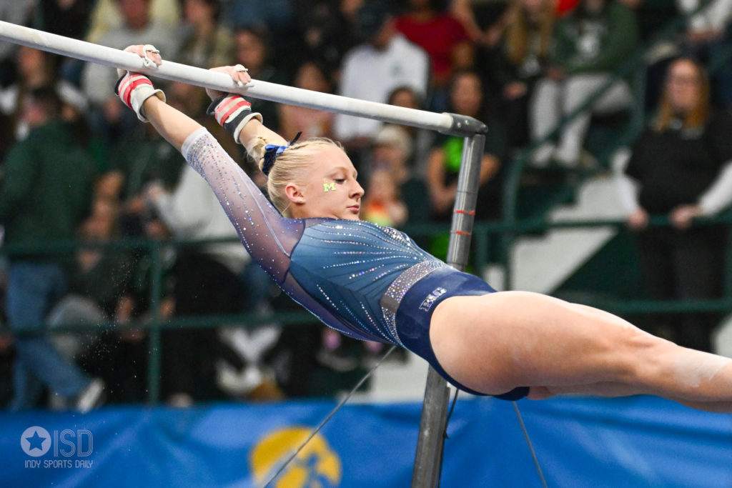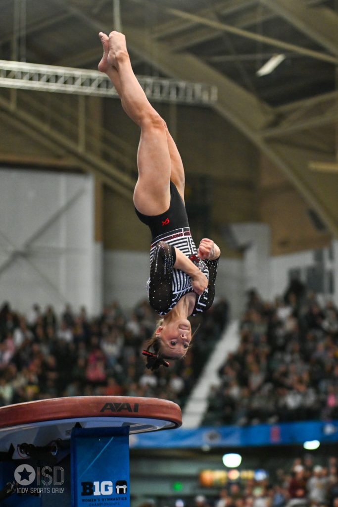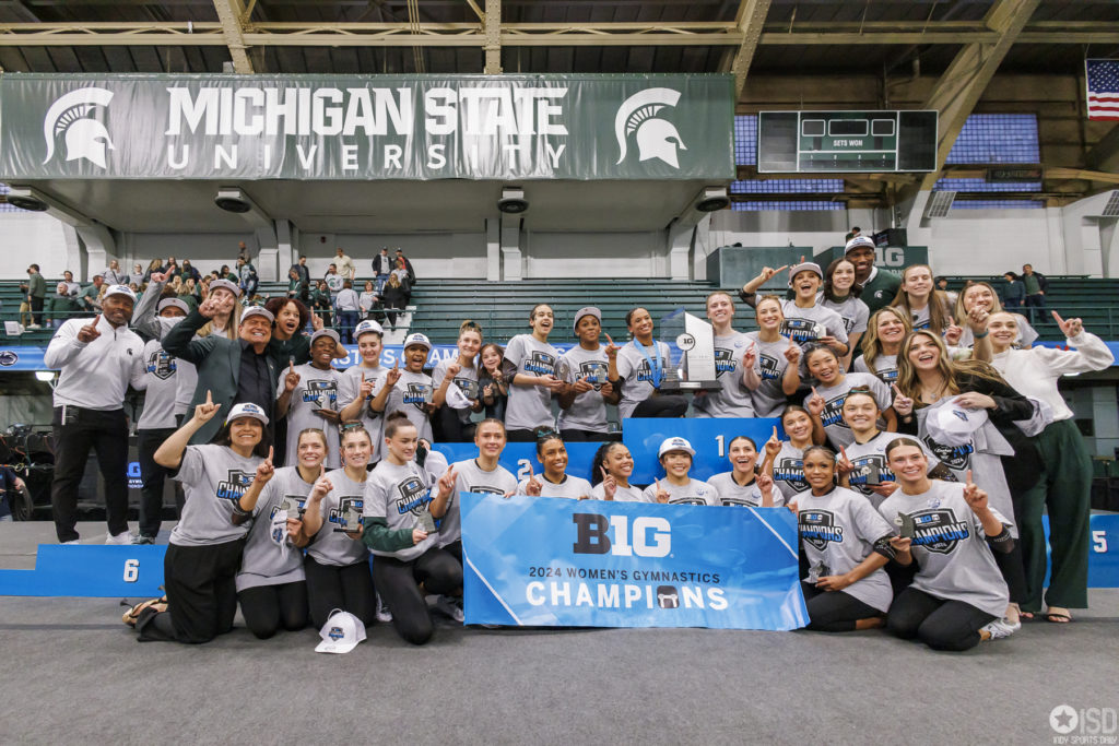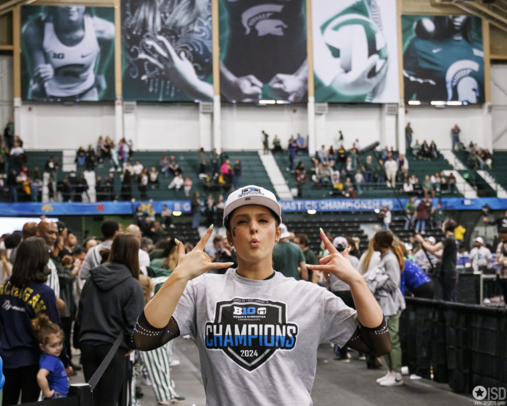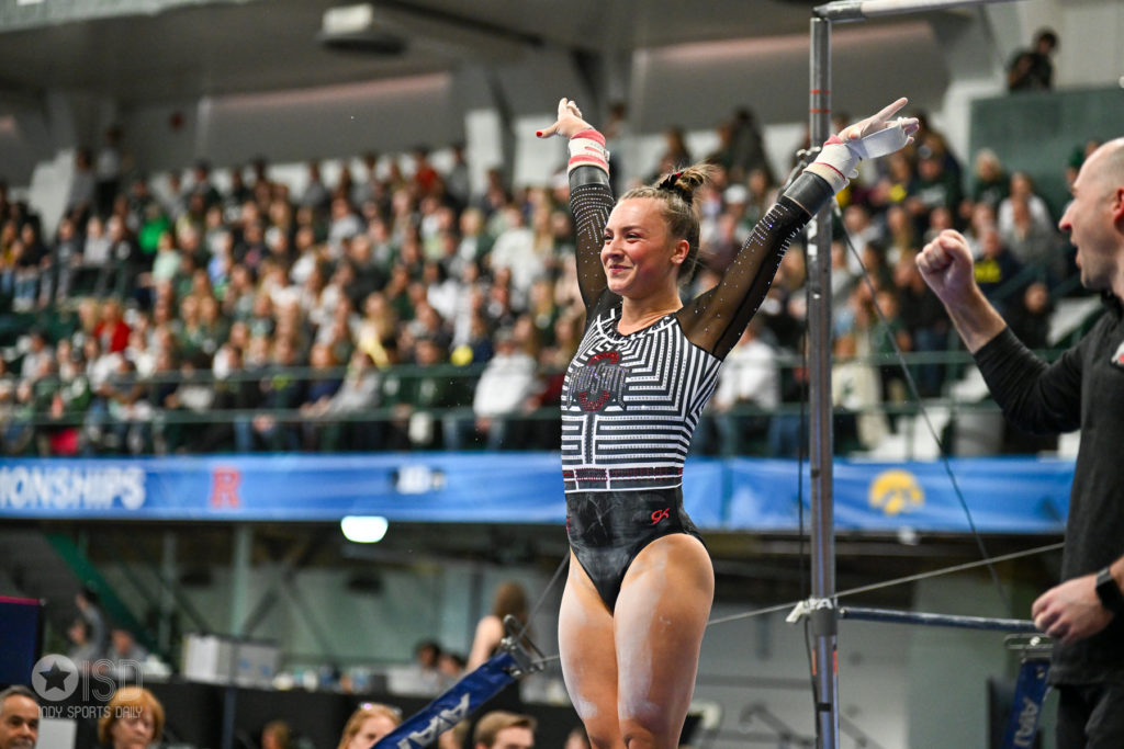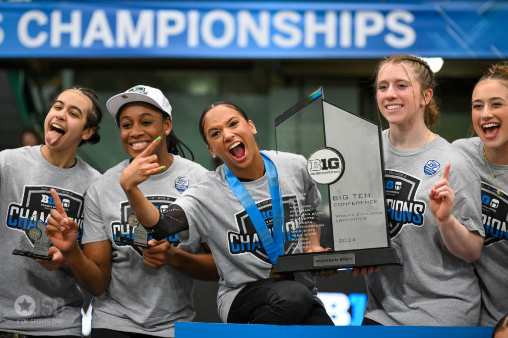 2024 B1G Women’s Gymnastics Championships Big Ten Big Ten Gymnastics Big Ten News Gymnastics by Tony Vasquez - March 25, 2024March 25, 20240 East Lansing, MI—The 42nd Big Ten Women’s Gymnastics Championships took place on Saturday, March 23, at Michigan State’s Jenison Field House in East Lansing, Michigan. The Championship was divided into two sessions: the afternoon session featured Nebraska, Iowa, Illinois, Maryland, Rutgers, and Penn State, while Michigan, Michigan State, Ohio State, and Minnesota competed in the evening. Michigan State clinched the Big Ten women’s gymnastics title with an impressive overall score of 197.600 in front of its home crowd. The victory marked its first conference championship in school history, and the Spartans also claimed the 2024 regular season title. Minnesota took second place with 197.500 points, and Michigan came in third with 197.225 points from the evening session. Ohio State secured fourth place with 197.050 points, while Maryland, Illinois, Nebraska, Penn State, Rutgers, and Iowa rounded out the standings in fifth to tenth place, respectively. Final results of the afternoon sessions: Maryland – 196.775 Illinois – 196.700 Nebraska – 196.250 Penn State – 195.825 Rutgers – 195.400 Iowa – 193.975 Final results of the evening sessions: Michigan State – 197.600 Michigan State – 197.600 Minnesota – 197.500 Ohio State – 197.050 ➡️ B1G Session Gallery: Session 2 gallery B1G Women’s Gymnastics Championships on March 23, 2024. Photo by Tony Vasquez B1G Women’s Gymnastics Championships on March 23, 2024. Photo by Tony Vasquez B1G Women’s Gymnastics Championships on March 23, 2024. Photo by Tony Vasquez B1G Women’s Gymnastics Championships on March 23, 2024. Photo by Tony Vasquez Ohio State’s Courtney McCann on beam. © Chris Shaw / IndySportsDaily B1G Women’s Gymnastics Championships on March 23, 2024. Photo by Tony Vasquez B1G Women’s Gymnastics Championships on March 23, 2024. Photo by Tony Vasquez Michigan’s Carly Bauman on the uneven bars. © Chris Shaw / IndySportsDaily B1G Women’s Gymnastics Championships on March 23, 2024. Photo by Tony Vasquez B1G Women’s Gymnastics Championships on March 23, 2024. Photo by Tony Vasquez Ohio State’s Nicole Riccardi on floor exercise. © Chris Shaw / IndySportsDaily B1G Women’s Gymnastics Championships on March 23, 2024. Photo by Tony Vasquez B1G Women’s Gymnastics Championships on March 23, 2024. Photo by Tony Vasquez Ohio State’s Ella Hodges on floor exercise. © Chris Shaw / IndySportsDaily B1G Women’s Gymnastics Championships on March 23, 2024. Photo by Tony Vasquez Ohio State’s Payton Harris on vault. © Chris Shaw / IndySportsDaily Ohio State’s Tory Vetter on the uneven bars. © Chris Shaw / IndySportsDaily B1G Women’s Gymnastics Championships on March 23, 2024. Photo by Tony Vasquez Michigan State’s Delanie Harkness on the uneven bars. © Chris Shaw / IndySportsDaily B1G Women’s Gymnastics Championships on March 23, 2024. Photo by Tony Vasquez B1G Women’s Gymnastics Championships on March 23, 2024. Photo by Tony Vasquez B1G Women’s Gymnastics Championships on March 23, 2024. Photo by Tony Vasquez B1G Women’s Gymnastics Championships on March 23, 2024. Photo by Tony Vasquez B1G Women’s Gymnastics Championships on March 23, 2024. Photo by Tony Vasquez B1G Women’s Gymnastics Championships on March 23, 2024. Photo by Tony Vasquez Michigan State coach Mike Rowe celebrates after winning the championship. © Chris Shaw / IndySportsDaily B1G Women’s Gymnastics Championships on March 23, 2024. Photo by Tony Vasquez B1G Women’s Gymnastics Championships on March 23, 2024. Photo by Tony Vasquez B1G Women’s Gymnastics Championships on March 23, 2024. Photo by Tony Vasquez B1G Women’s Gymnastics Championships on March 23, 2024. Photo by Tony Vasquez Michigan State celebrates winning the 2024 championship. © Chris Shaw / IndySportsDaily All-Championship Team Sierra Brooks, MICH Gabby Wilson, MICH Carly Bauman, MICH Skyla Schulte, MICH Jenna Mulligan, MICH Mya Hooten, MINN Gianna Gerdes, MINN Sarah Moraw, MINN Lauren Pearl, MINN Katie Horak, MINN Ella Sirjord, MINN Sage Kellerman, MSU Olivia Zsarmani, MSU Nikki Smith, MSU Baleigh Garcia, MSU Elle Beaufait, MSU MaKayla Tucker, MSU Gabrielle Stephen, MSU Csenge Bácskay, NEB Emma Spence, NEB Martina Comin, NEB Sophia McClelland, NEB Arielle Ward, ILL Mia Takekawa, ILL Kadyn Fitzgibbon, ILL Mia Townes, ILL Payton Harris, OSU Nicole Riccardi, OSU Tory Vetter, OSU Ella Hodges, OSU Savannah Gonzalez, OSU Alexa Rothenbuescher, MD Rhea LeBlanc, MD Madeline Komoroski, MD Bailey Libby, IOWA Gabrielle Dildy, RUT Amani Herring, PSU Isabella Salcedo, PSU