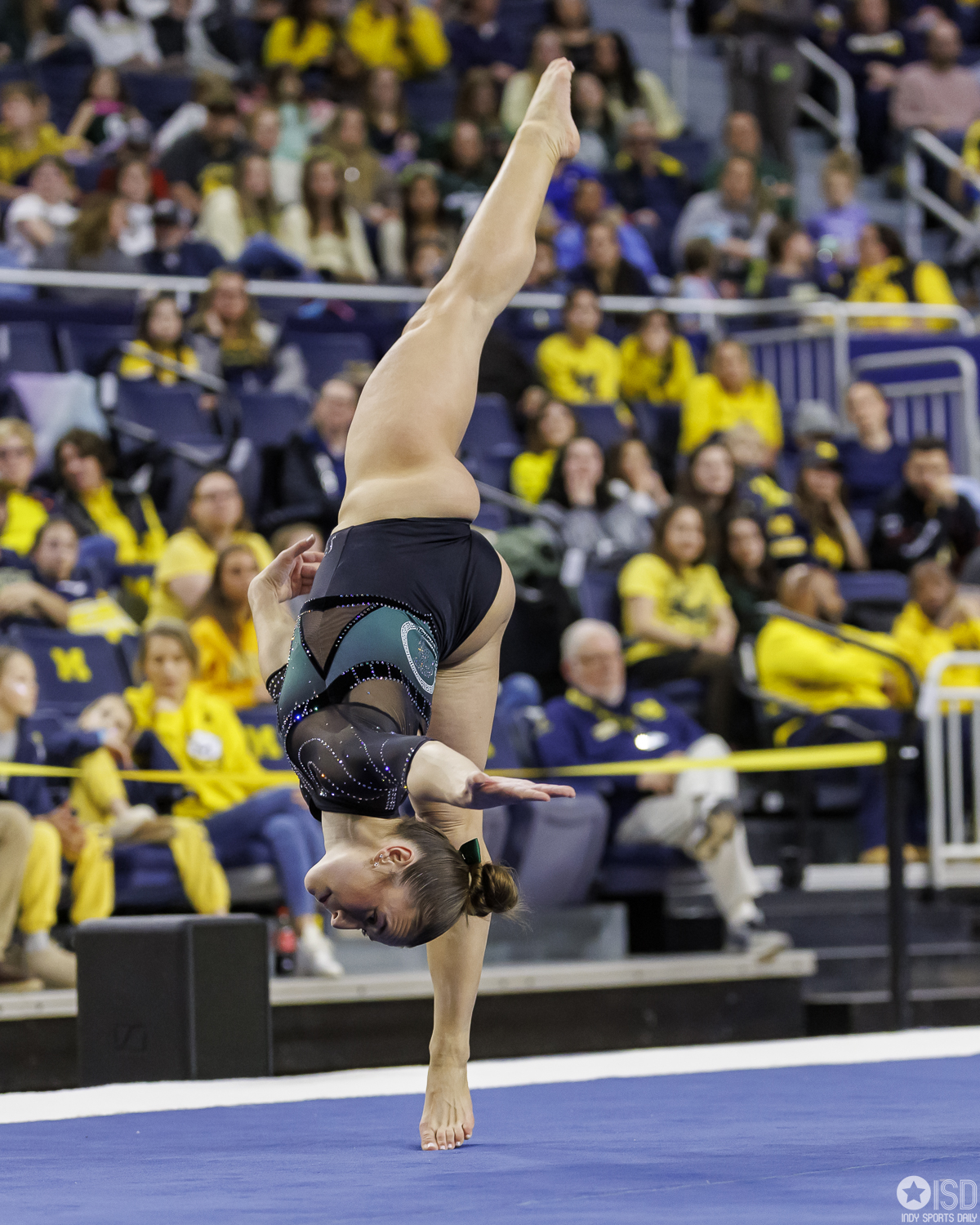 Michigan State proved just steady enough as the Spartans built their total on balance across all four events, never dipping below a 49.275 and answering Michigan’s surges with poise. They opened on uneven bars highlighted by Sage Kellerman’s 9.925 and Olivia Zsarmani’s 9.900. From there, the meet settled into a back-and-forth rhythm.