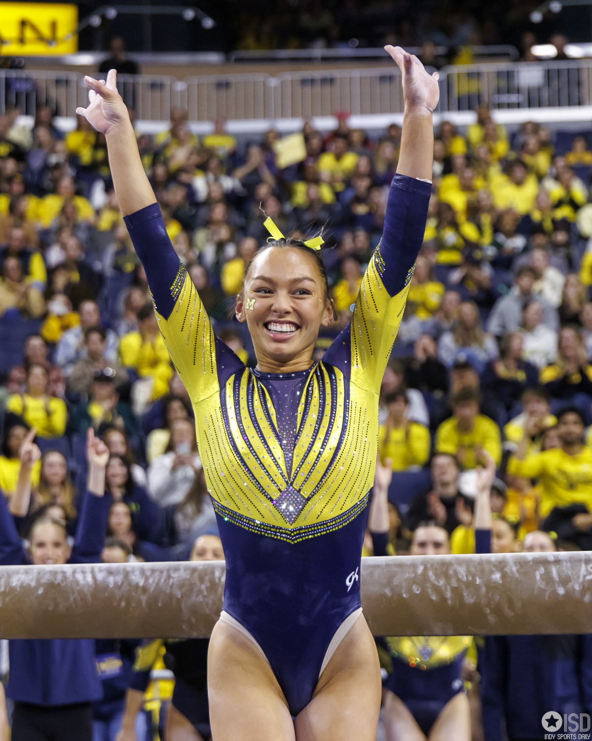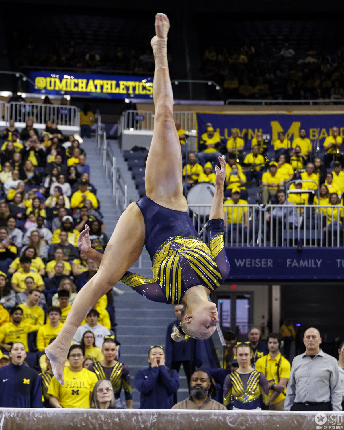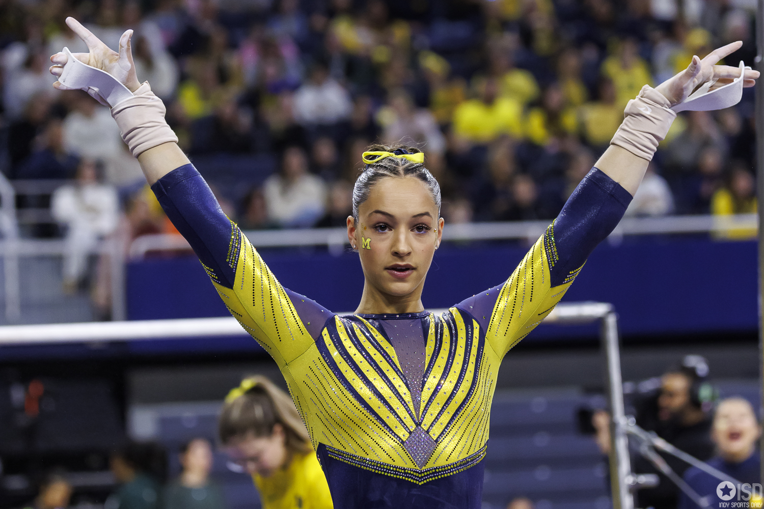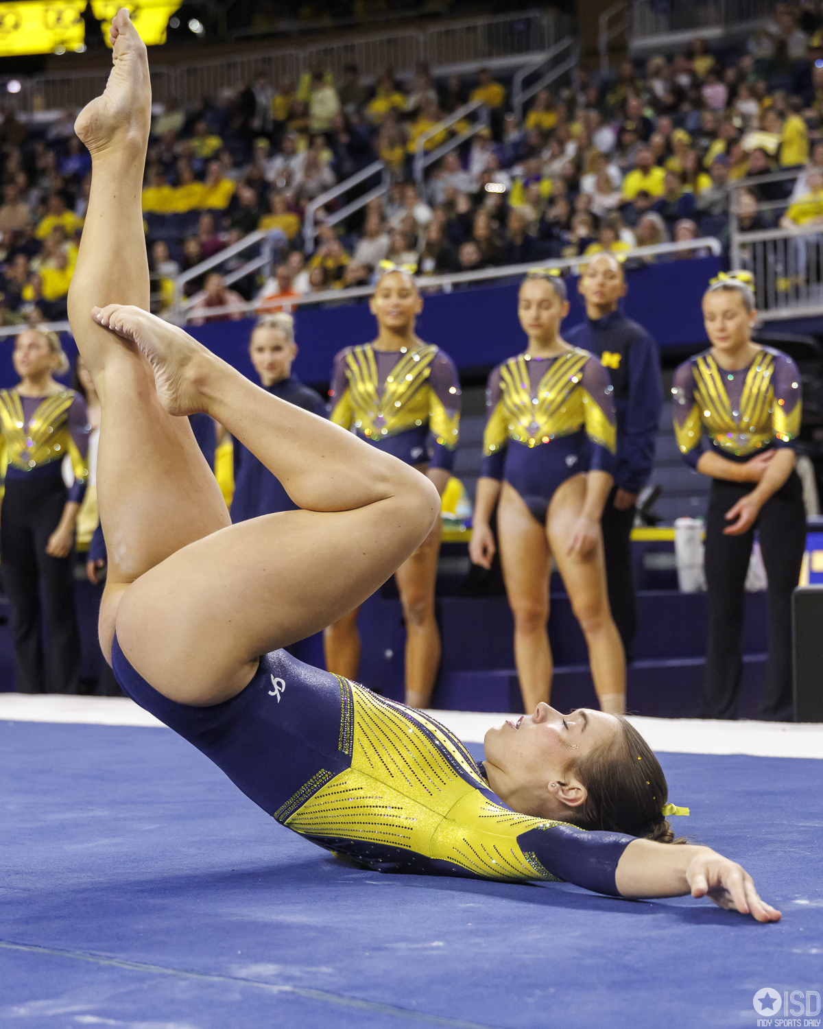 Michigan countered on vault with a powerful 49.325, paced by Reyna Guggino’s 9.900 and a duo of 9.875s from Kayli Boozer and Sophia Diaz. The Wolverines looked every bit the home team early, attacking landings and feeding off the arena’s energy.