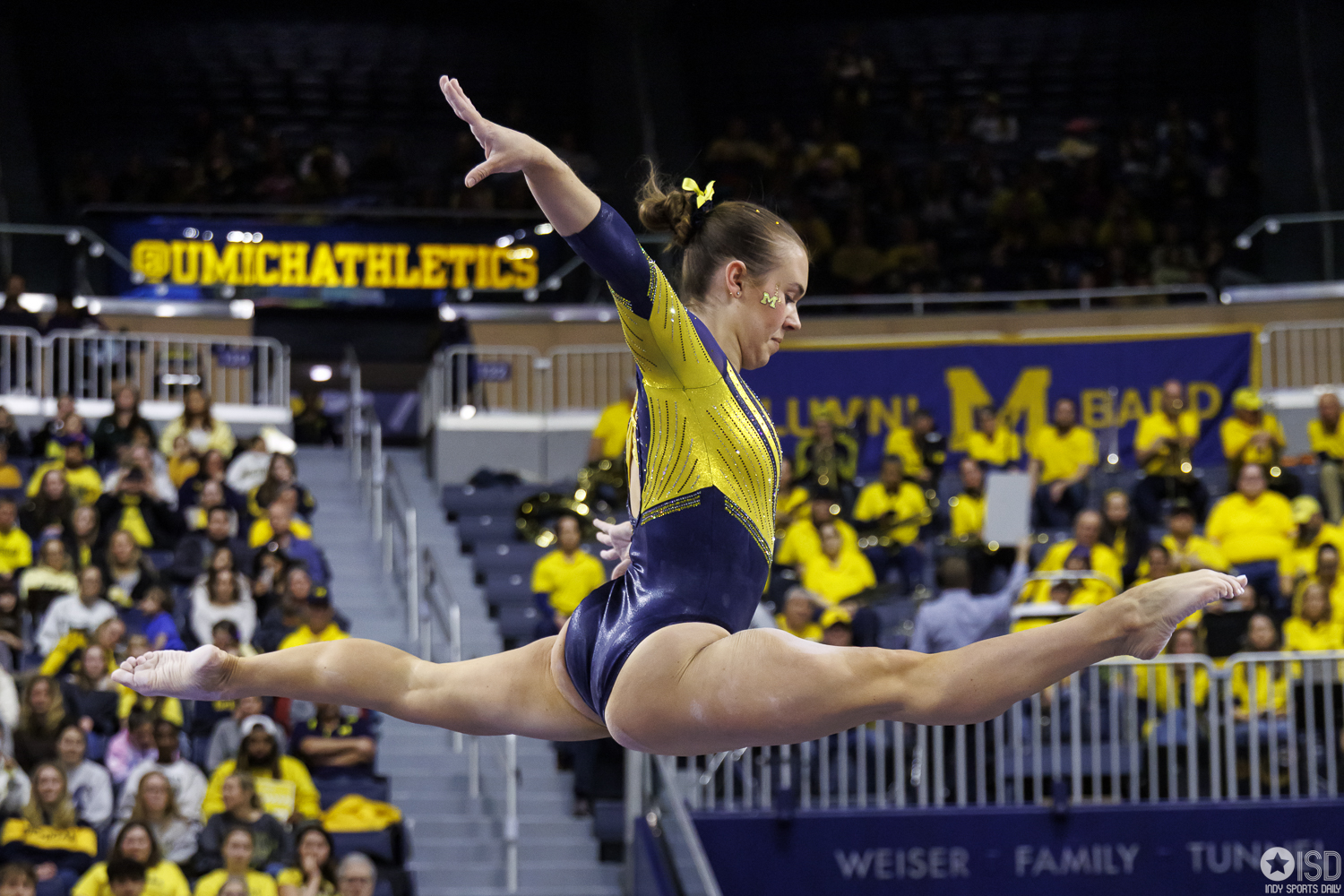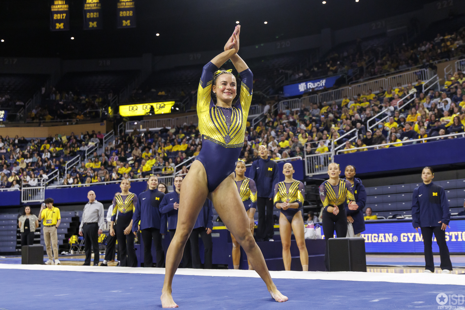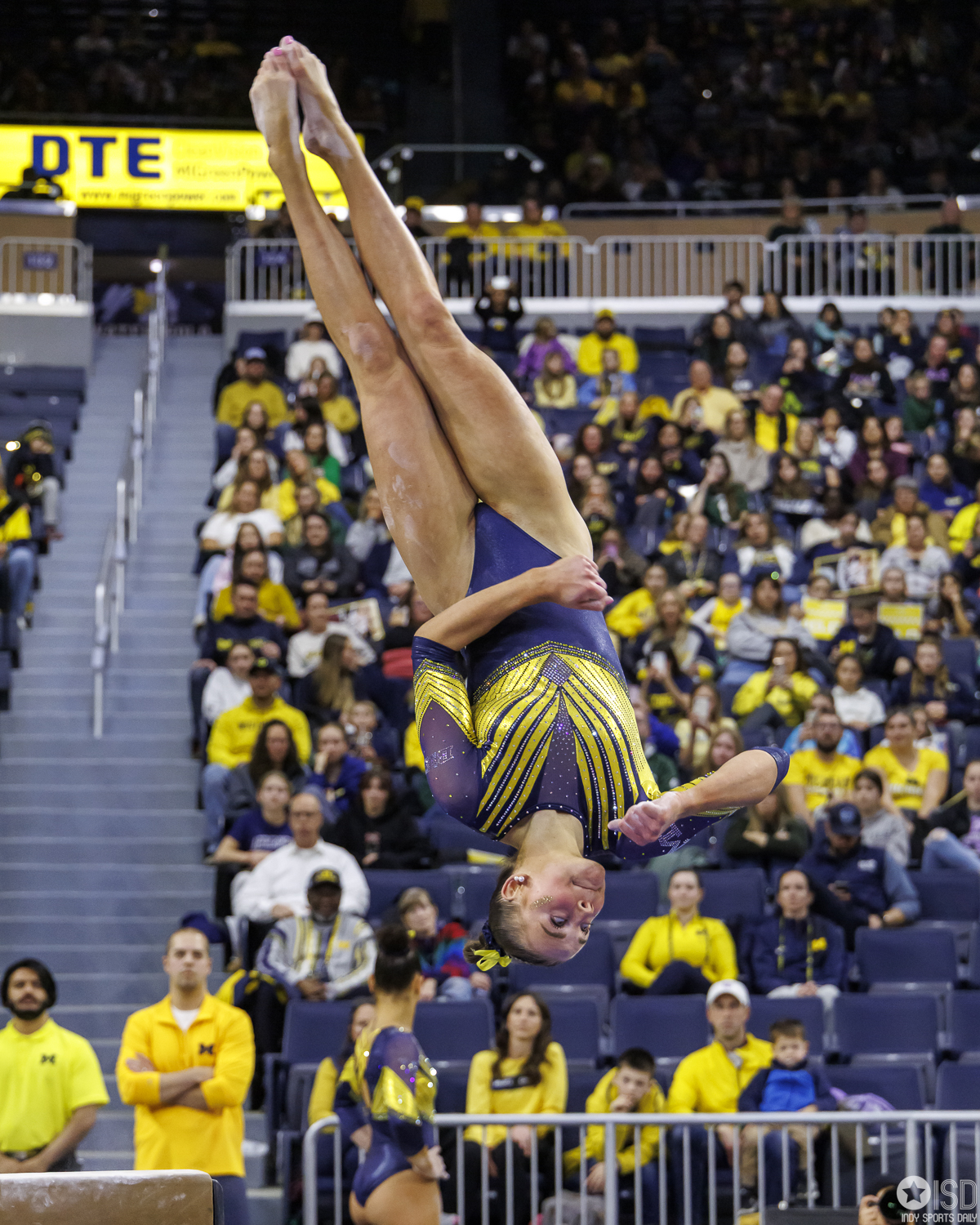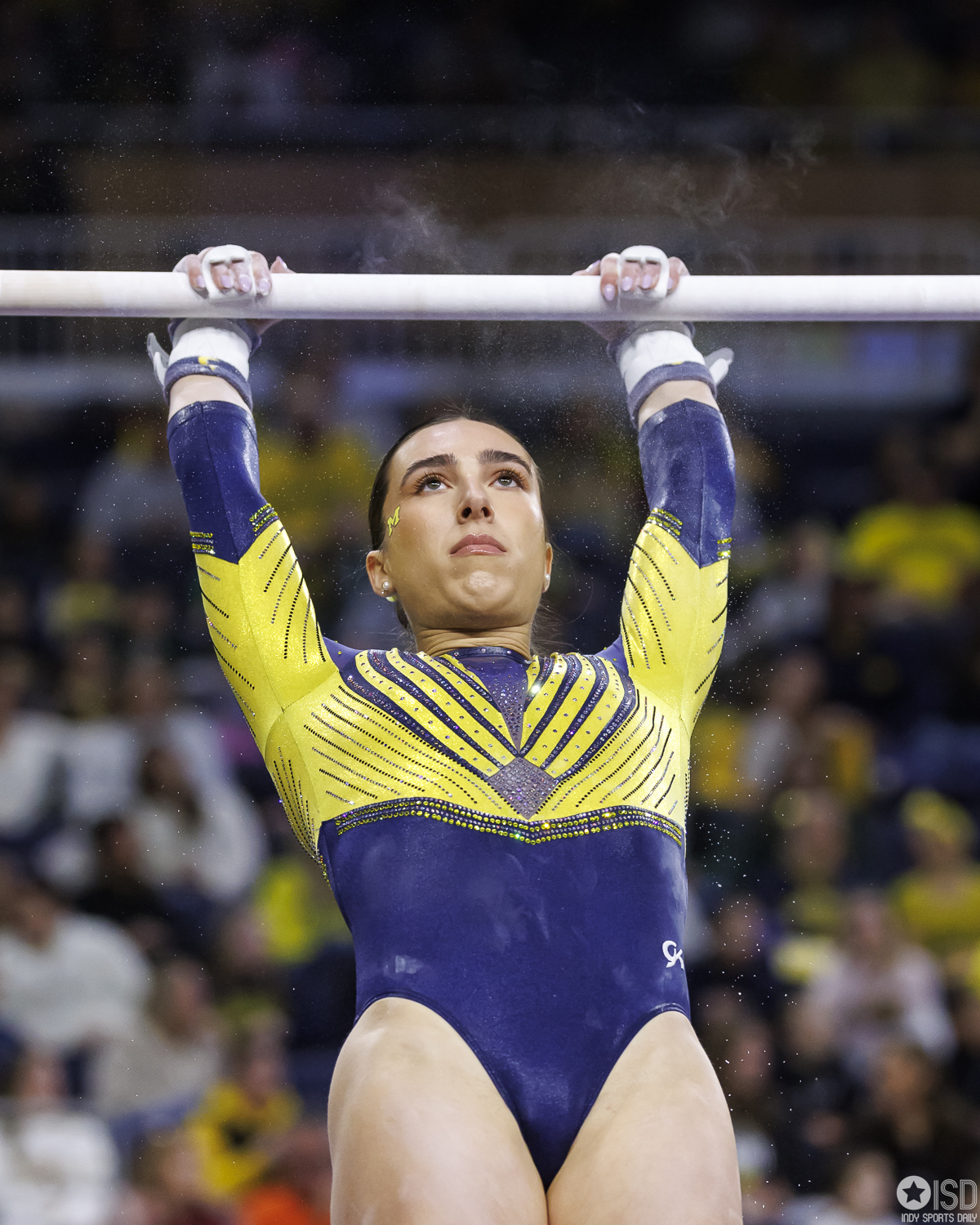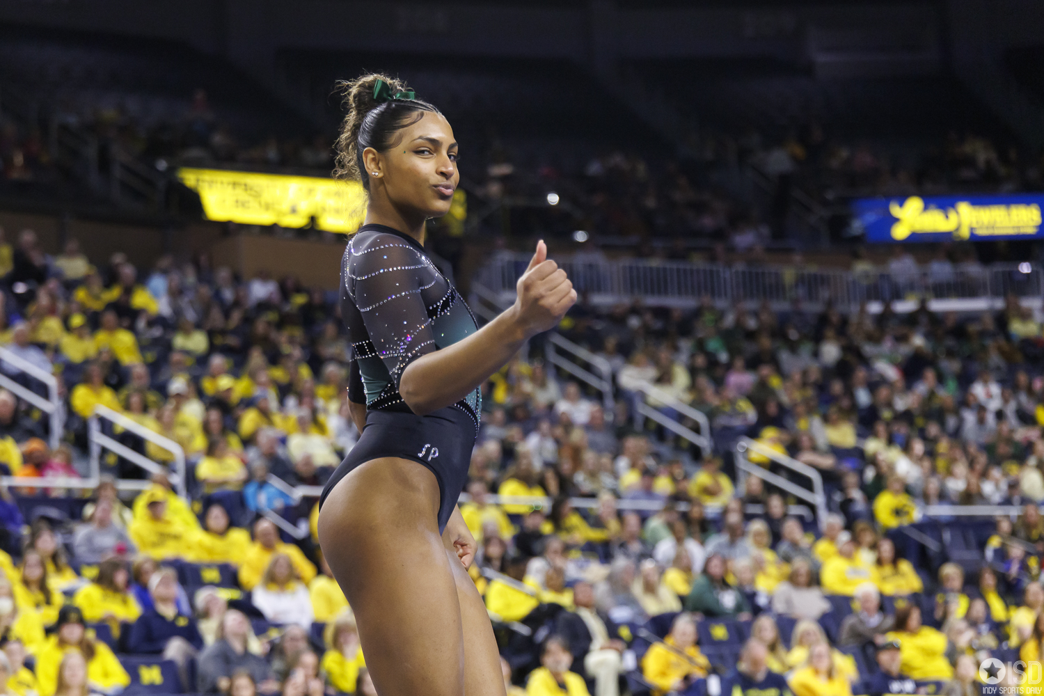 Michigan countered on vault with a powerful 49.325, paced by Reyna Guggino’s 9.900 and a duo of 9.875s from Kayli Boozer and Sophia Diaz. The Wolverines looked every bit the home team early, attacking landings and feeding off the arena’s energy.