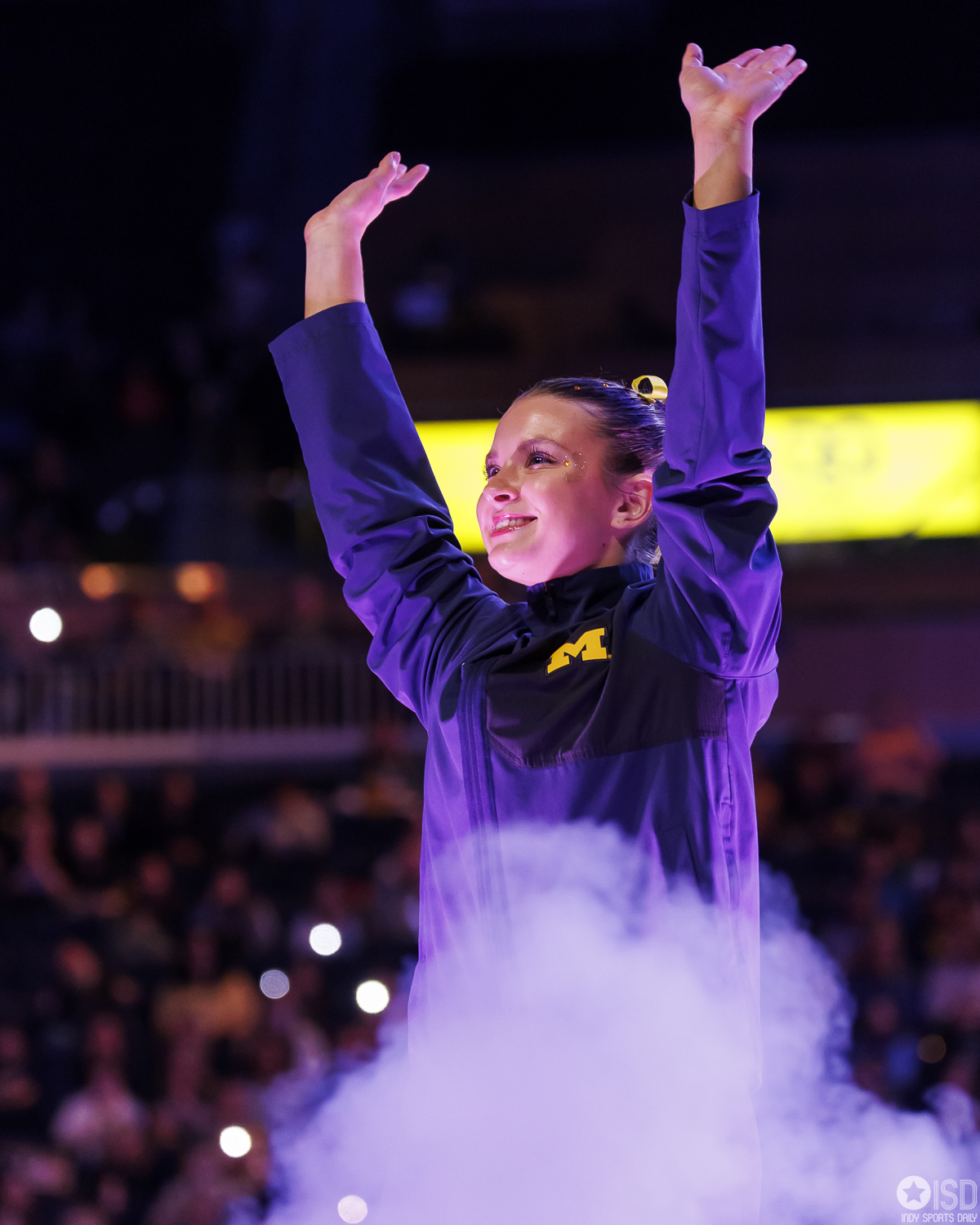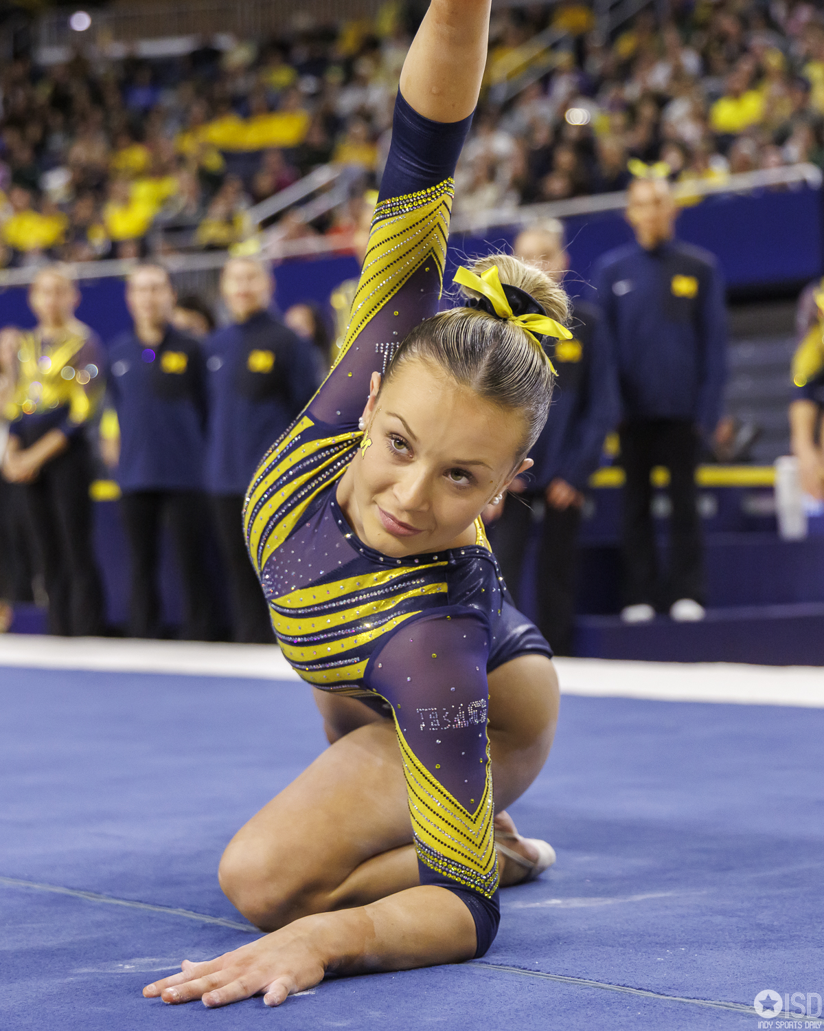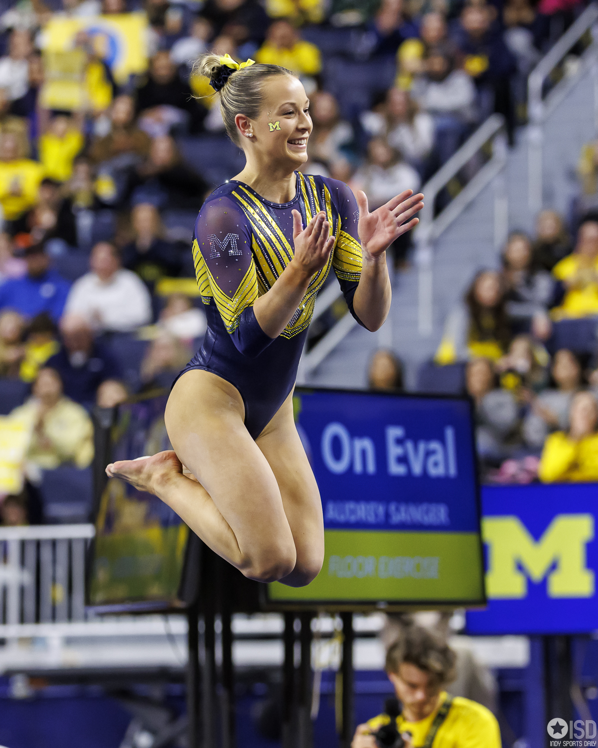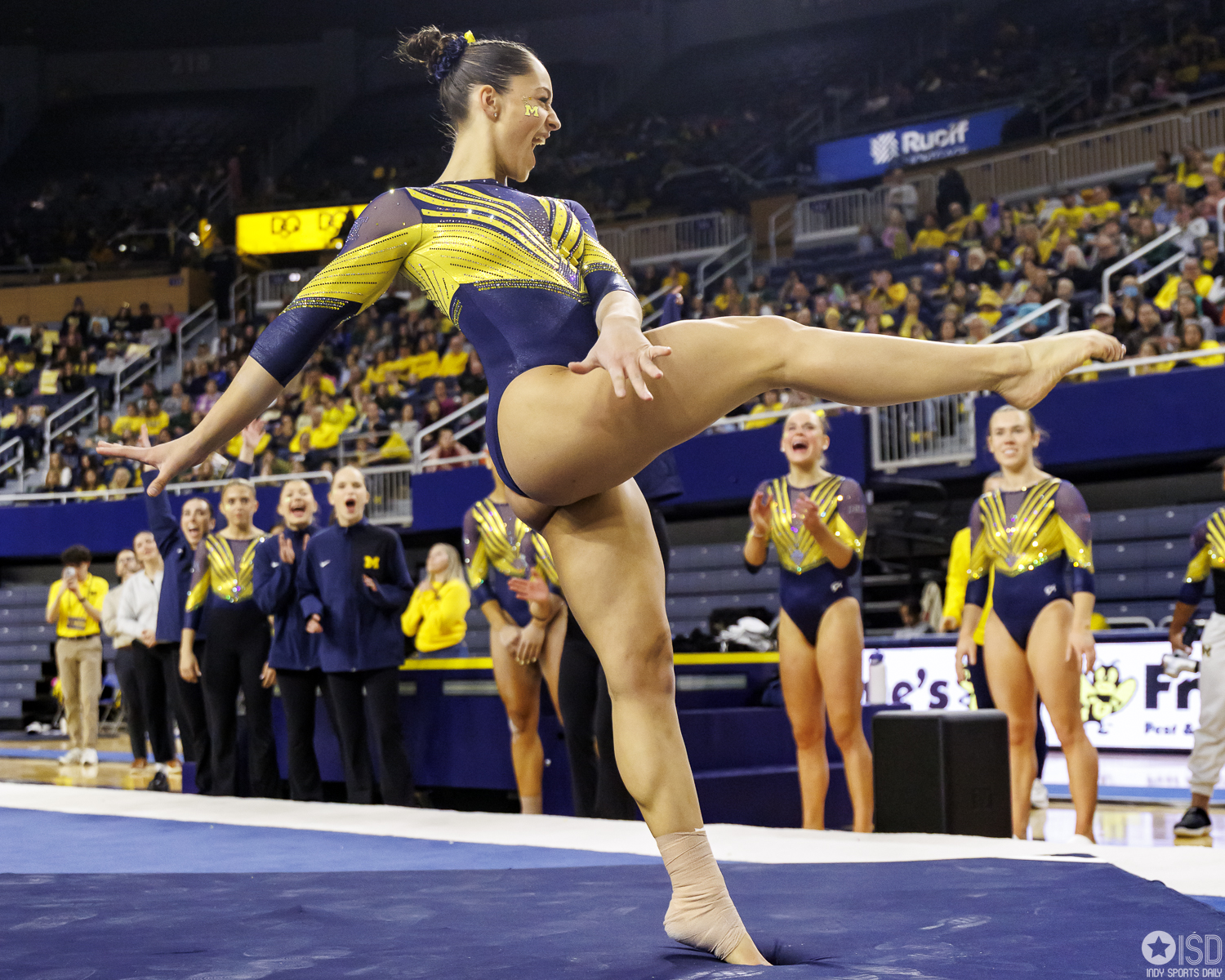 Michigan countered on vault with a powerful 49.325, paced by Reyna Guggino’s 9.900 and a duo of 9.875s from Kayli Boozer and Sophia Diaz. The Wolverines looked every bit the home team early, attacking landings and feeding off the arena’s energy.