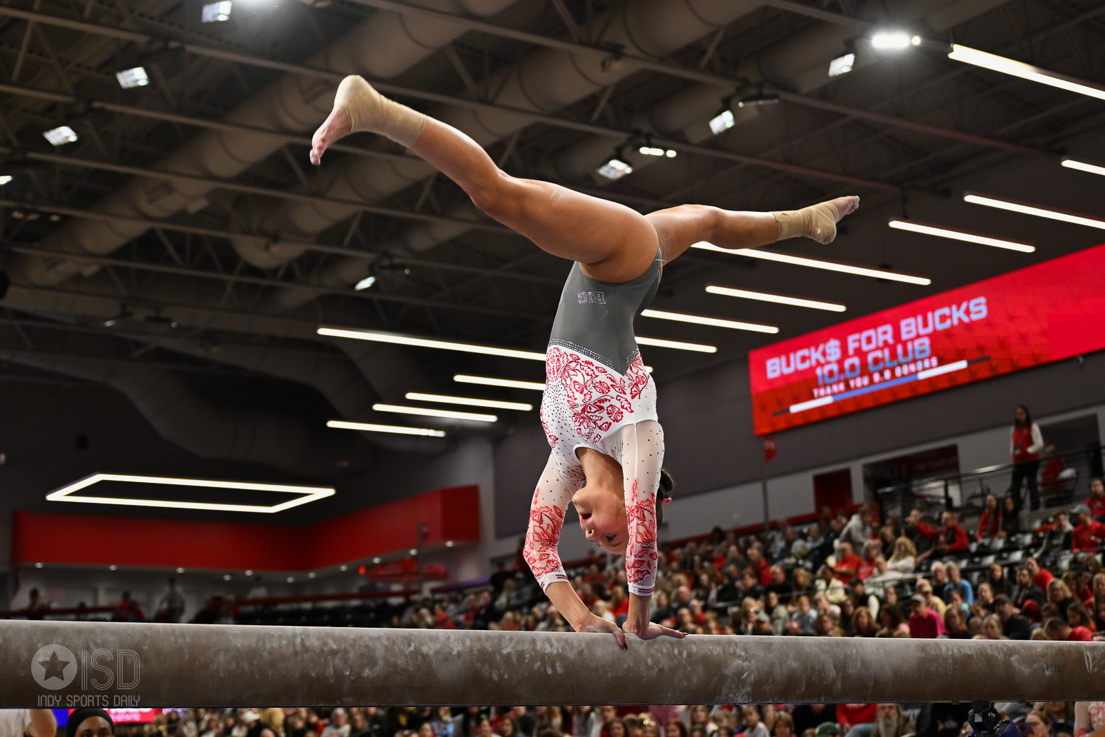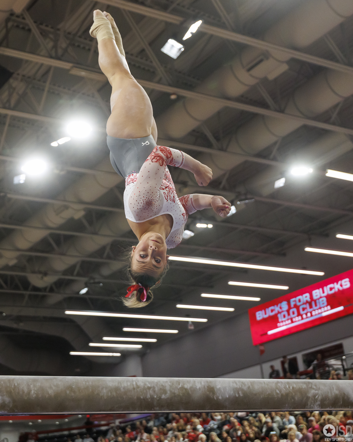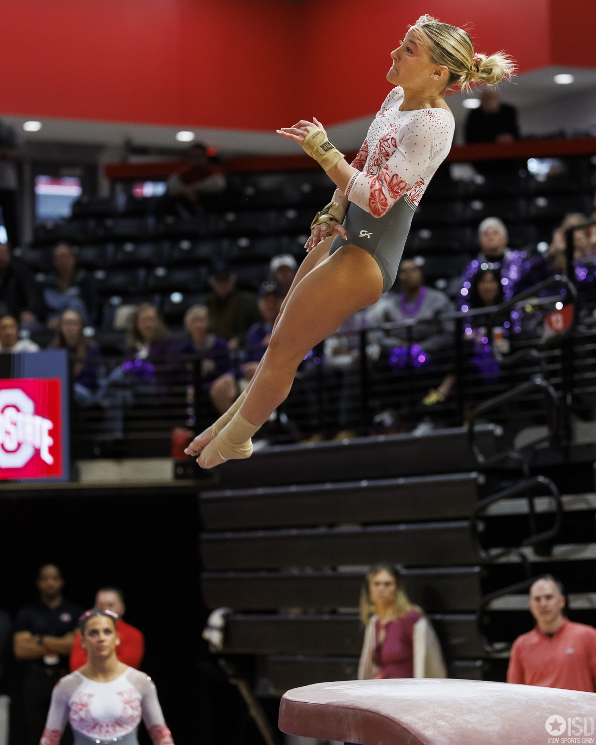 Ohio State falls to Washington 196.475–196.300 on Saturday, February 14, 2026, at the Covelli Center in Columbus. Photo by Tony Vasquez for Indy Sports Daily
